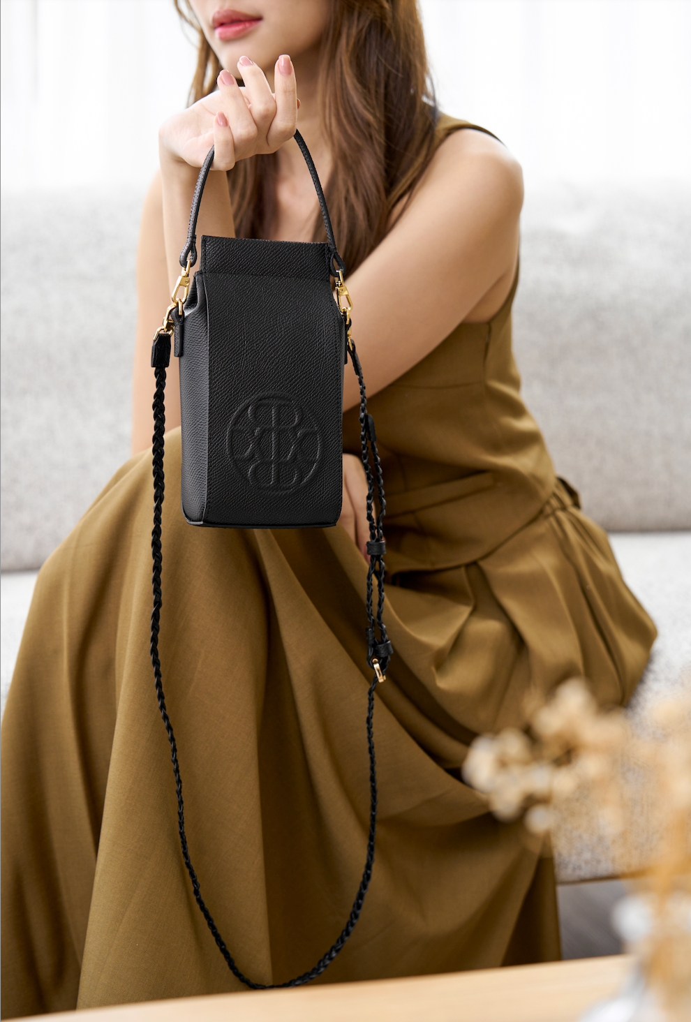 - Adjustable braided leather strap (crossbody or shoulder carry)
